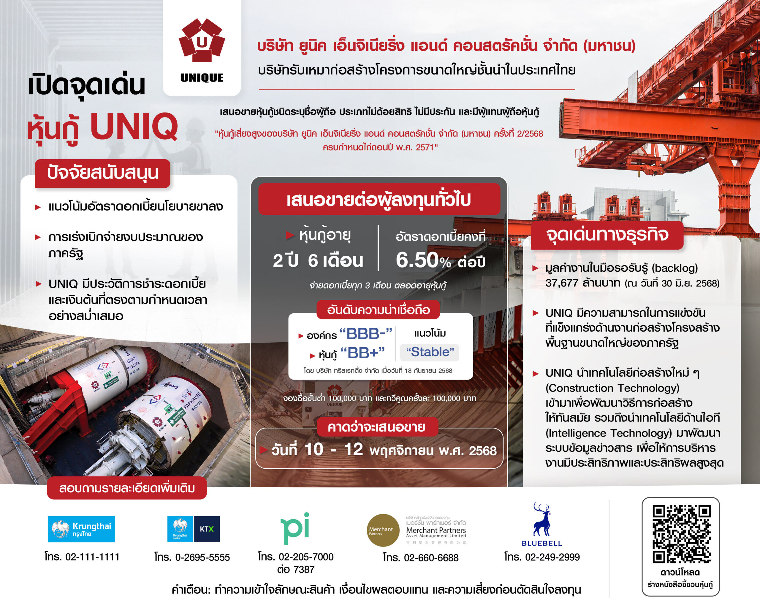 นายเติมพงษ์ เหมาะสุวรรณ รองกรรมการผู้จัดการอาวุโสฝ่ายบริหาร กลุ่มงานบัญชีและการเงิน บริษัท ยูนิค เอ็นจิเนียริ่ง แอนด์ คอนสตรัคชั่น จำกัด (มหาชน) หรือ UNIQ บริษัทรับเหมาก่อสร้างชั้นนำของไทย เปิดเผยว่า หุ้นกู้ชนิดระบุชื่อผู้ถือ ประเภทไม่ด้อยสิทธิ ไม่มีประกัน และมีผู้แทนผู้ถือหุ้นกู้ อายุ 2 ปี 6 เดือน อัตราดอกเบี้ยคงที่ 6.50% ต่อปี ชำระดอกเบี้ยทุก ๆ 3 เดือน ตลอดอายุหุ้นกู้ ที่บริษัทเตรียมออกและเสนอขายต่อประชาชนเป็นการทั่วไป ระหว่างวันที่ 10-12 พฤศจิกายน พ.ศ. 2568 จะได้รับการตอบรับที่ดีจากผู้ลงทุนเหมือนทุกครั้งที่ผ่านมา ด้วยปัจจัยสนับสนุนหลายประการ ไม่ว่าจะเป็นอายุของหุ้นกู้ อัตราผลตอบแทน รวมถึงความมั่นคงของกิจการ โดยหุ้นกู้ชุดดังกล่าวได้รับการจัดอันดับความน่าเชื่อถือจากบริษัท ทริสเรทติ้ง จำกัด เมื่อวันที่ 18 กันยายน พ.ศ. 2568 ที่อันดับ BB+ แนวโน้ม “Stable” และอันดับความน่าเชื่อถือขององค์กรที่ อันดับ BBB- แนวโน้ม “Stable” (คงที่)
