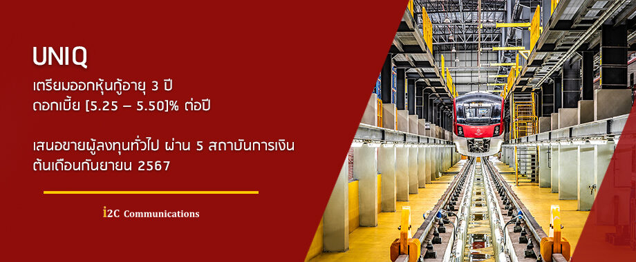 UNIQ เตรียมออกหุ้นกู้อายุ 3 ปี ดอกเบี้ย [5.25 – 5.50]% ต่อปี เสนอขายผู้ลงทุนทั่วไป ผ่าน 5 สถาบันการเงิน ต้นเดือนกันยายน 2567 สิงหาคม 2, 2024 i2C Media Release บมจ.ยูนิค เอ็นจิเนียริ่ง แอนด์ คอนสตรัคชั่น (UNIQ) บริษ […]