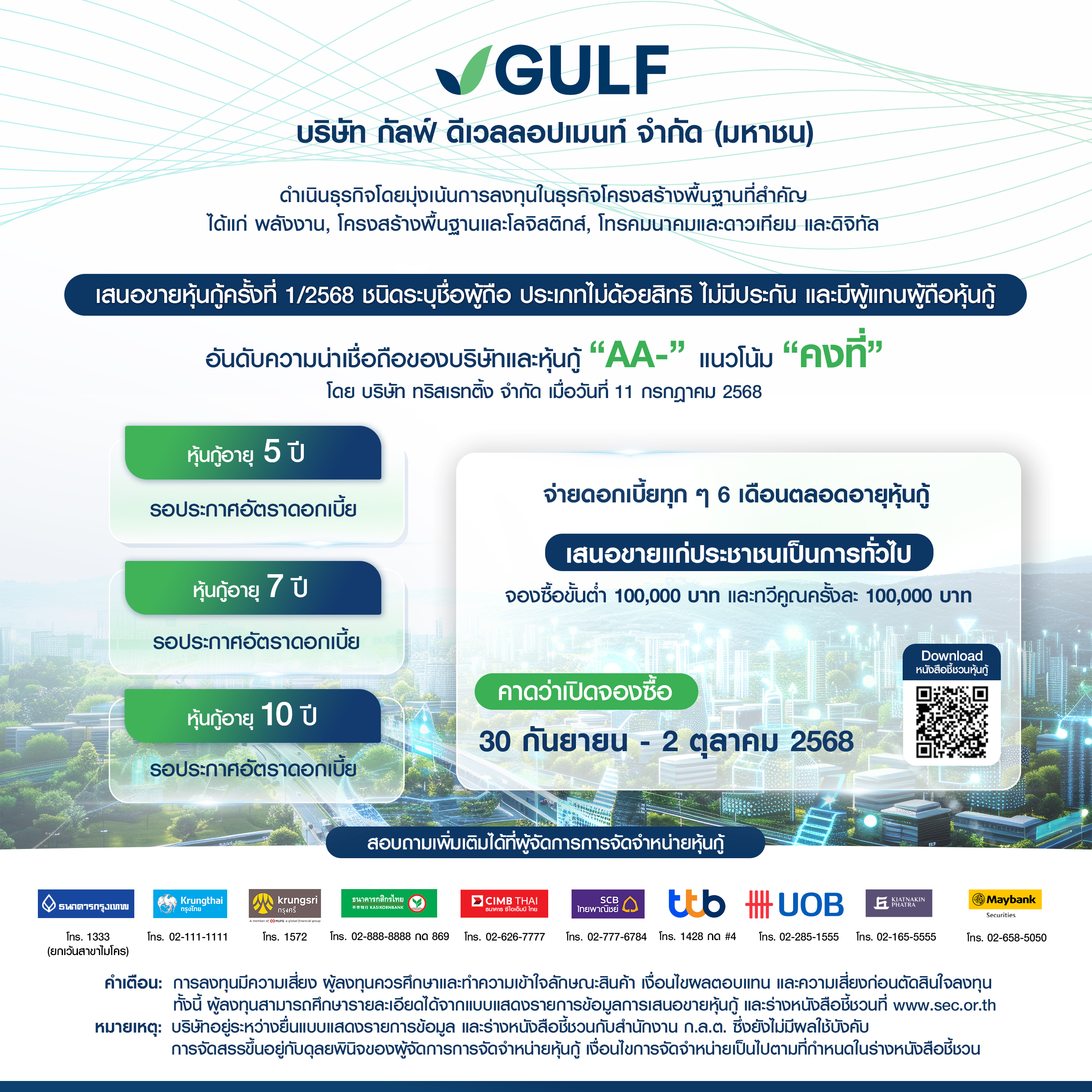 การออกและเสนอขายหุ้นกู้ในครั้งนี้ เป็นการออกหุ้นกู้ครั้งแรก ภายใต้ “บริษัท กัลฟ์ ดีเวลลอปเมนท์ จำกัด (มหาชน)” บริษัทใหม่หลังการควบรวมกิจการกับบริษัท อินทัช โฮลดิ้งส์ จำกัด (มหาชน) ซึ่งทำให้ GULF มีพอร์ตโฟลิโอทางธุรกิจที่หลากหลายและสมดุลมากขึ้น รวมถึงมีสถานะทางการเงินที่แข็งแกร่งขึ้น ตลอดจนกระแสเงินสดที่มั่นคง มีการกระจายการลงทุนอย่างมีประสิทธิภาพ และการได้รับเงินปันผลที่เพิ่มขึ้น โดยเฉพาะจากบริษัท แอดวานซ์ อินโฟร์ เซอร์วิส จำกัด (มหาชน) (ADVANC) ซึ่งช่วยเพิ่มศักยภาพการแข่งขันทางธุรกิจให้กับบริษัททั้งในระดับประเทศ และระดับสากล พร้อมสร้างการเติบโตอย่างยั่งยืนในระยะยาว โดยจะเห็นได้ว่าอันดับเครดิตทั้งขององค์กรและหุ้นกู้ที่จัดโดยบริษัท ทริสเรทติ้ง จำกัด ล่าสุดเมื่อวันที่ 11 กรกฎาคม 2568 อยู่ที่ระดับ “AA-” แนวโน้ม “Stable” หรือ “คงที่” ซึ่งเป็นการปรับเพิ่มขึ้นจากระดับ “A+” (อันดับเครดิตองค์กรเดิม) และ “A” (อันดับเครดิตหุ้นกู้เดิม)