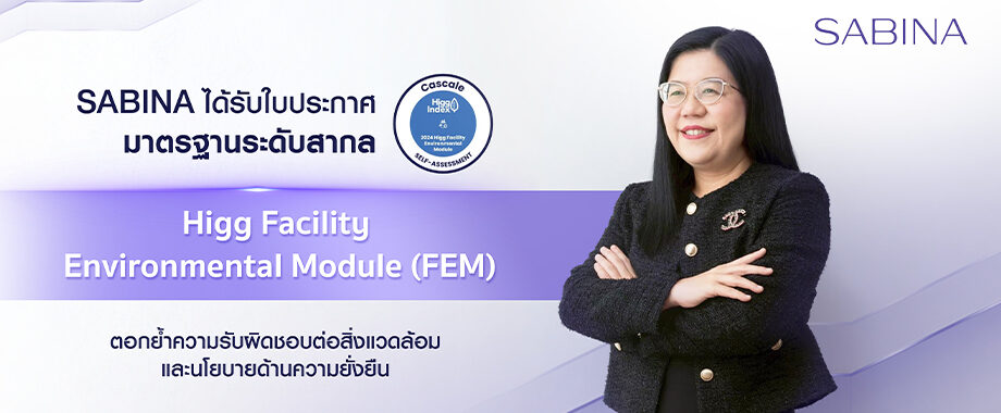 SABINA คว้าใบประกาศมาตรฐานระดับสากล Higg Facility Environmental Module (FEM) ซึ่งเป็นมาตรฐานด้านความยั่งยืนที่ประเมินความเกี่ยวข้องด้านสิ่งแวดล้อมของโรงงาน ครอบคลุมทั้งระบบบริหารจัดการสิ่งแวดล้อม การใช้พลังงาน และการปล่อยก๊าซเรือนกระจก รวมถึงการใช้น้ำในกระบวนการผลิต และการกำจัดขยะ เผยมาตรฐาน Higg ตอกย้ำความมุ่งมั่นในการดำเนินธุรกิจอย่างมีความรับผิดชอบต่อสังคม รวมถึงยังส่งผลดีโดยตรงกับธุรกิจรับจ้างผลิต (OEM) ที่ปัจจุบัน ลูกค้าในยุโรปวางเกณฑ์ด้าน ESG ในการเลือกผู้ผลิตเข้มข้นมากขึ้น